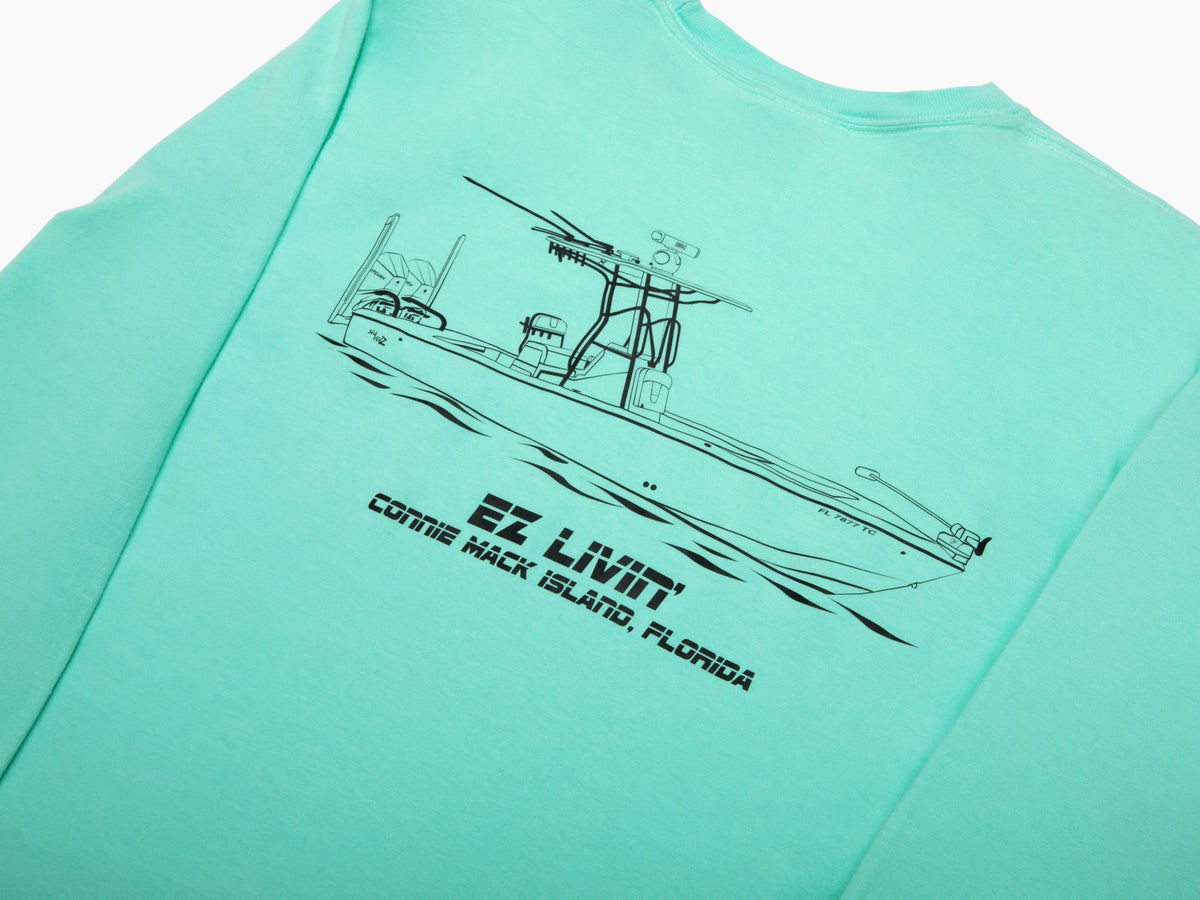 Made with high-quality cotton, our Comfort Colors™ long sleeve t-shirts have the perfect, comfortable worn-in feel that you’ll want to wear every day. Featuring a pocket on the front chest where we can print your boat name on and a large graphic of your boat on the back of the shirt.